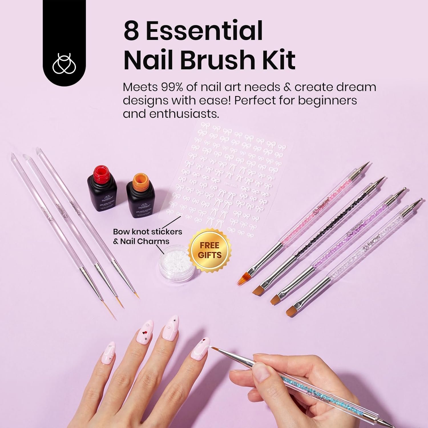 - 8 Pcs Nail Brush Kit: Our nail art brush set includes 8 double-headed brushes, with Bow knot stickers & Rhinestones. Whether it’s for applying color /glitter gel, gradient blending, or dot / flower painting, shell swirl effects, and rhinestone application, it can handle it all with ease. It’s perfect for nail art beginners and enthusiasts.