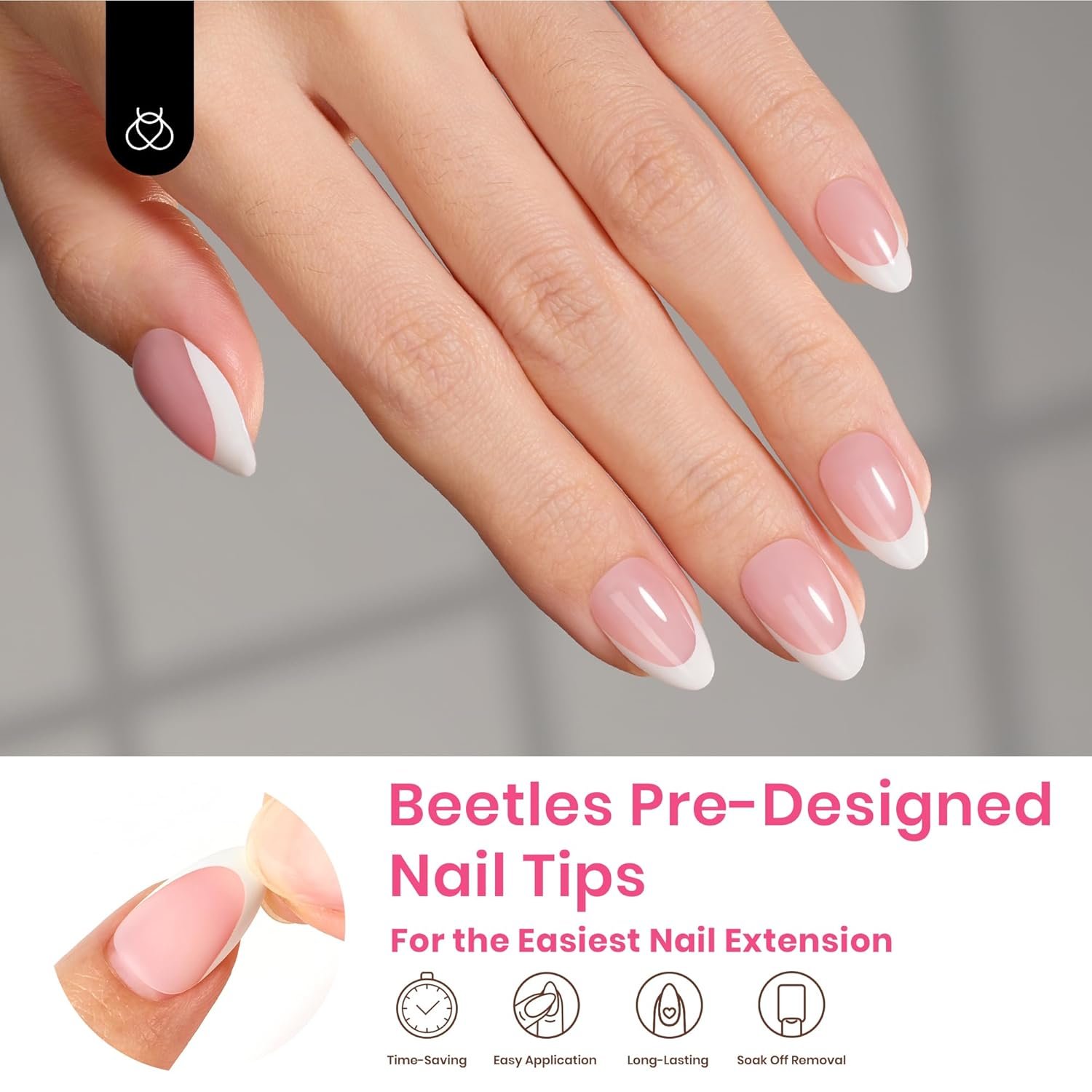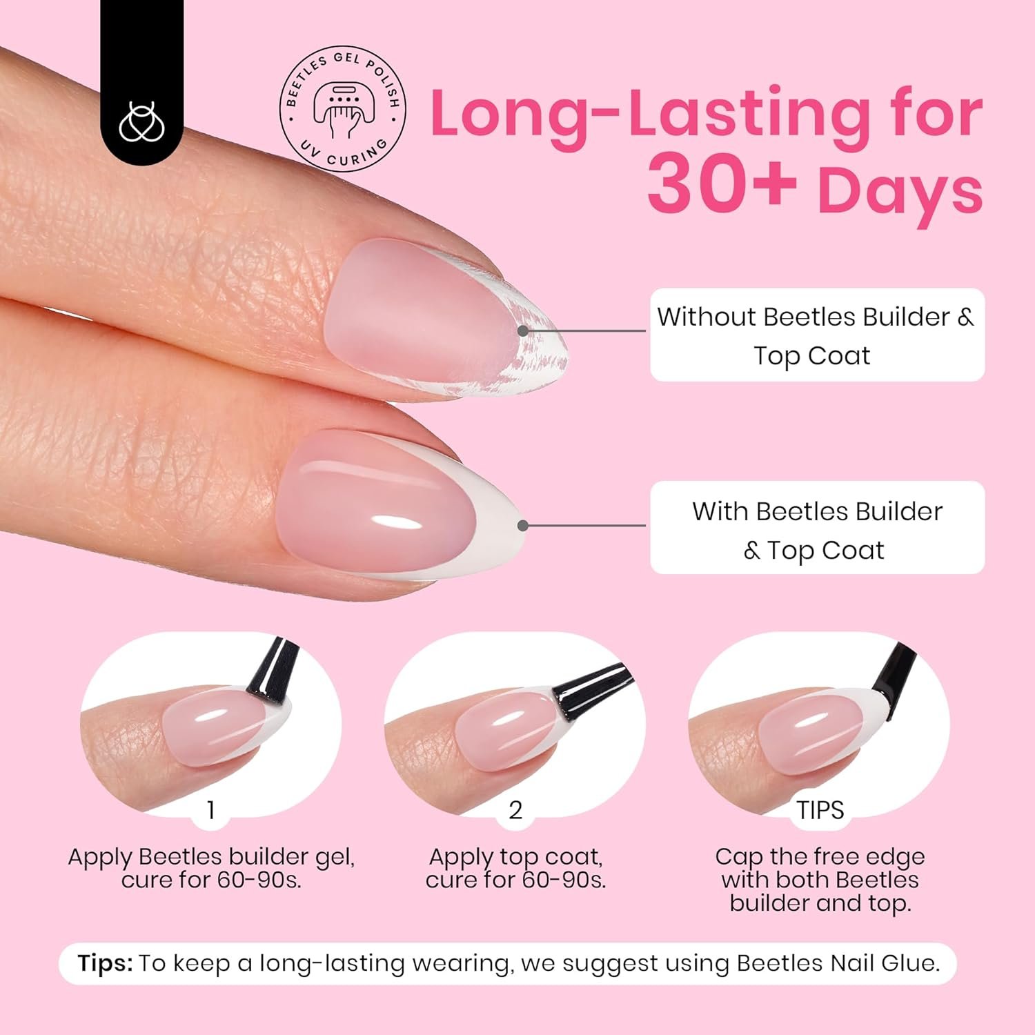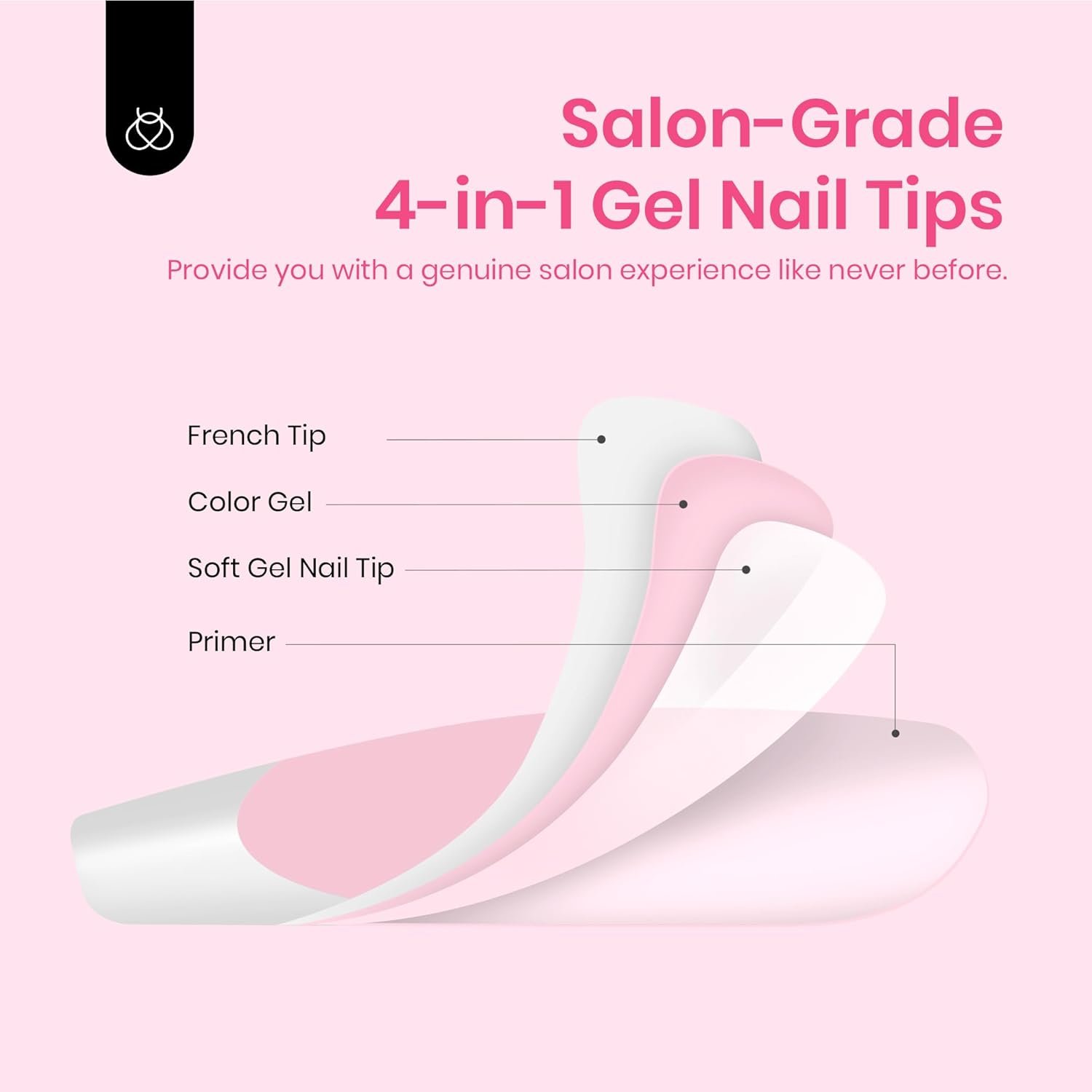 - 【4 in 1 Pre-applied & Easy to use】 Pink Short Almond Press On Nails 4 in 1 Pre-applied with primer, soft gel tips, color gel and french Degin. They are more malleable, more natural, and pre-shaped. You can stick them on your nails with glue, then apply one layer of builder gel and one layer of top coat, and you’re done, Even beginners can create salon-like nail extensions in a short time! (Not including builder gel and top coat)