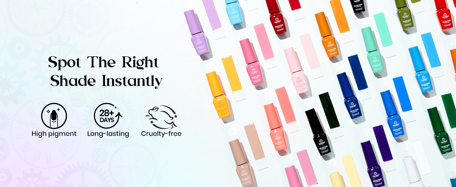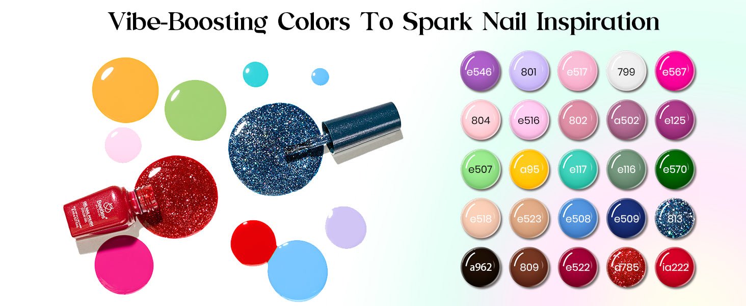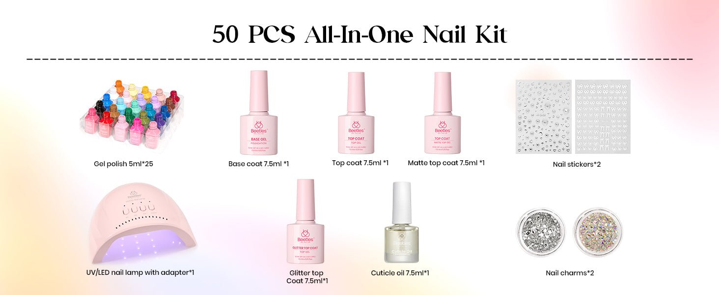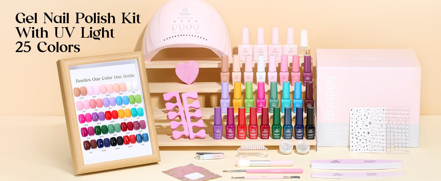 - This Gel Nail Polish Kit includes 25 multi-color gel nail polish for all season, 1 bottle of base coat, 1 bottle of no wipe top coat, 1 bottle of matte top coat, 1 bottle of glitter top coat, a professional nail lamp, and 28 pcs nail stuff tools. Meet your nail Manicure needs at home. The new appearance design of gel polish helps you have quick fashionable manicure. You can easily find the color of nail polish which you need from the shelf.