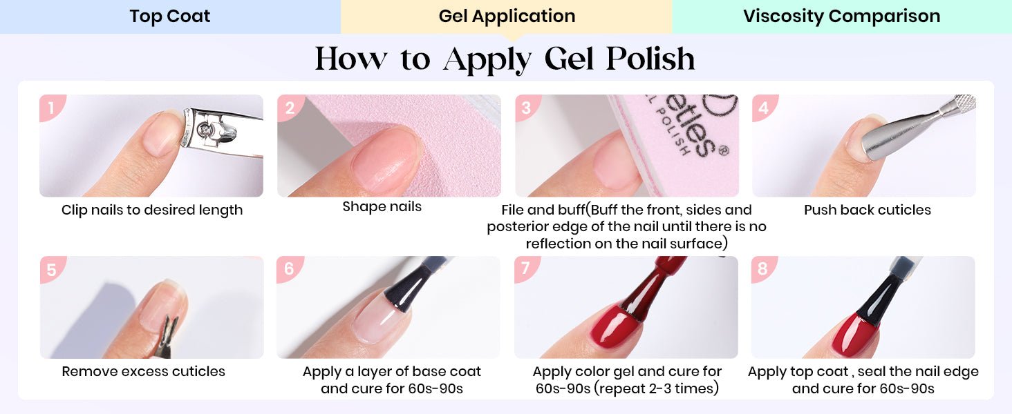 Tips for preventing nail surface peeling off: (1) Polishing of the nail surface: Polish the front, side and trailing edge of the nail until there are no reflective spots on the nail surface(2) Nail surface cleaning: It is recommended to use Nail dehydrator to remove oil and moisture from the nail surface(3)Lighting time: It is recommended that the lighting time for base Coat, Color Gel and Top Coat at least 60 seconds.