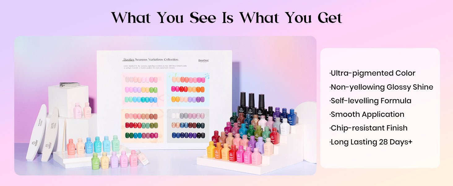 - 48 Gorgeous Colors for All Occasions – A complete palette of trendy shades including nudes, pastels, bold brights, glitters, and dark tones. Perfect for daily wear, parties, holidays, season and weddings.