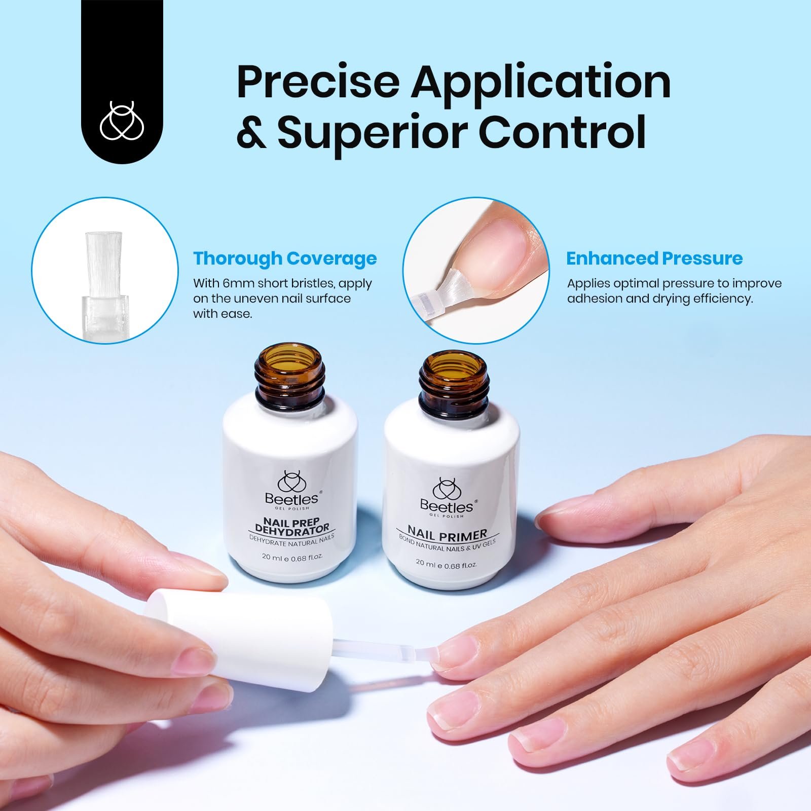 - 【Large Capacity & Short Brush Bristles】: Beetles launches the latest 20ml high-capacity NAIL DEHYDRATOR AND NAIL PRIMER SET! Our nail primer uses 6mm short brush bristles, which is more closely attached to the nail surface and subjected to more force compared to conventional long brush bristles. This allows the nail primer to better penetrate into the polish marks on the nail surface, greatly increasing the combining degree between the nail primer and the nail surface!