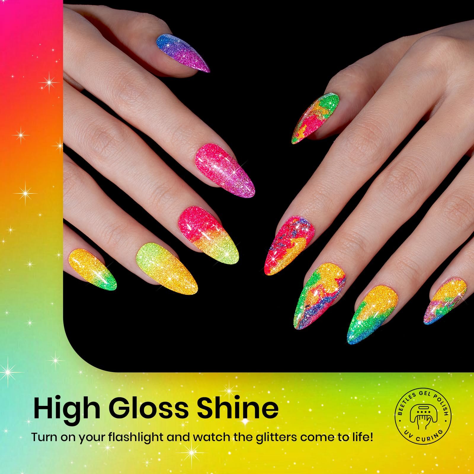 💡 Cure Under UV/LED Lamp: Cure your Beetles reflective glitter gel nail polish under a UV/LED nail lamp for the best results. Enjoy a salon-like, neon glow effect from the comfort of your home! Embrace the vibrant spirit of summer with Neon Carnival nails.