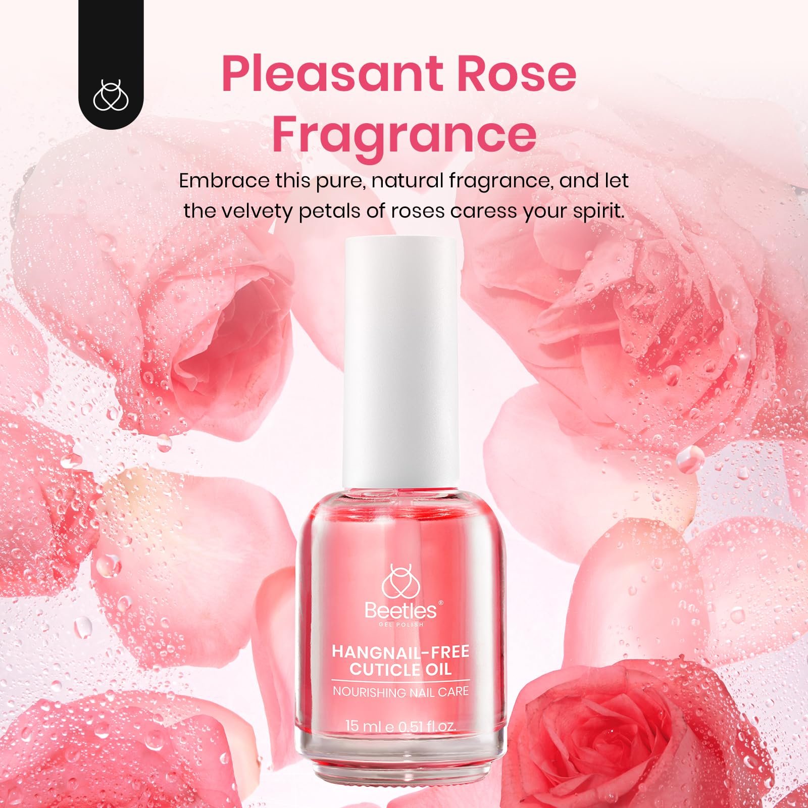 Natural Ingredients: Beetles nutritious & healthy nail care rose fragrance cuticle oil contains real natural nutrient ingredients ( Jojoba Oil、Olive Oil、Vitamin E) that moisturize the cuticles and strengthen the nails.