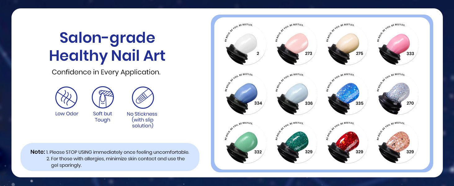 • Package Includes: Beetles Starry Party poly nail gel kit includes 10g*12, Slip Solution 30ml*1, Base Coat 7.5ml*1, Top Coat 7.5ml*1, Rhinestone Glue Gel 5g*1, Nail Lamp*1, Nail Clips*5, Handle Grip Nail Brush*1, Plastic Dual Forms*48, Nail Clipper*1, Nail Sequins*1(Shipped Randomly), Dual-end Cuticle Pusher*1, Tweezer*1, Nail Dust Brush*1, Nail Buffer*1, Nail File*1, Double-ended Nail Art Pen*1. Stickers*1(Shipped Randomly). You can enjoy the fun of nail DIY at home and create all kinds of beautiful nail styles.
