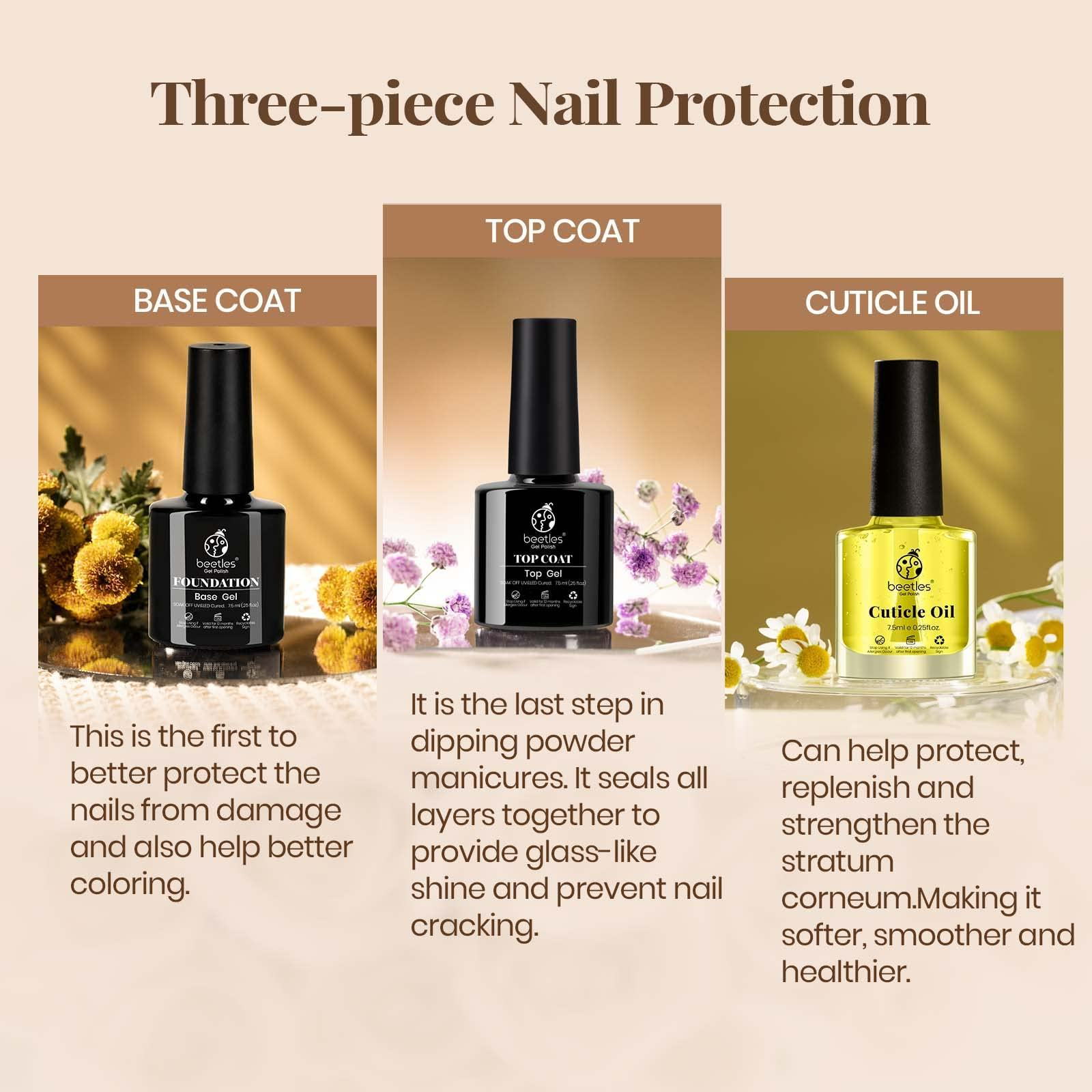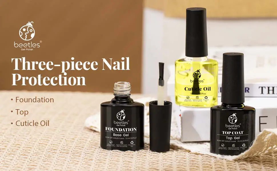 - Beetles Top Base Coat & Cuticle Oil Set: 3pcs 7.5ml, Long-lasting for 21+ days with a perfect shine. A flexible topcoat prevents nicks, chips, or smudges. Cuticle oil will leave your cuticles and nails looking natural and beautiful for a Spring gift for Her.