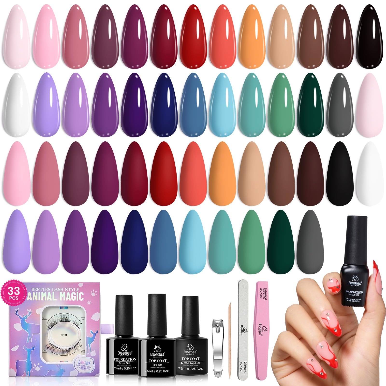 - What You Get: The Beetles gel polish set includes 25 mini gel colors (5ml each) and 3 no-wipe base and top coats (glossy and matte, 7.5ml each). Additionally, it comes with a nail buffer, a nail file, nail clippers, a cuticle stick, and an instruction manual.