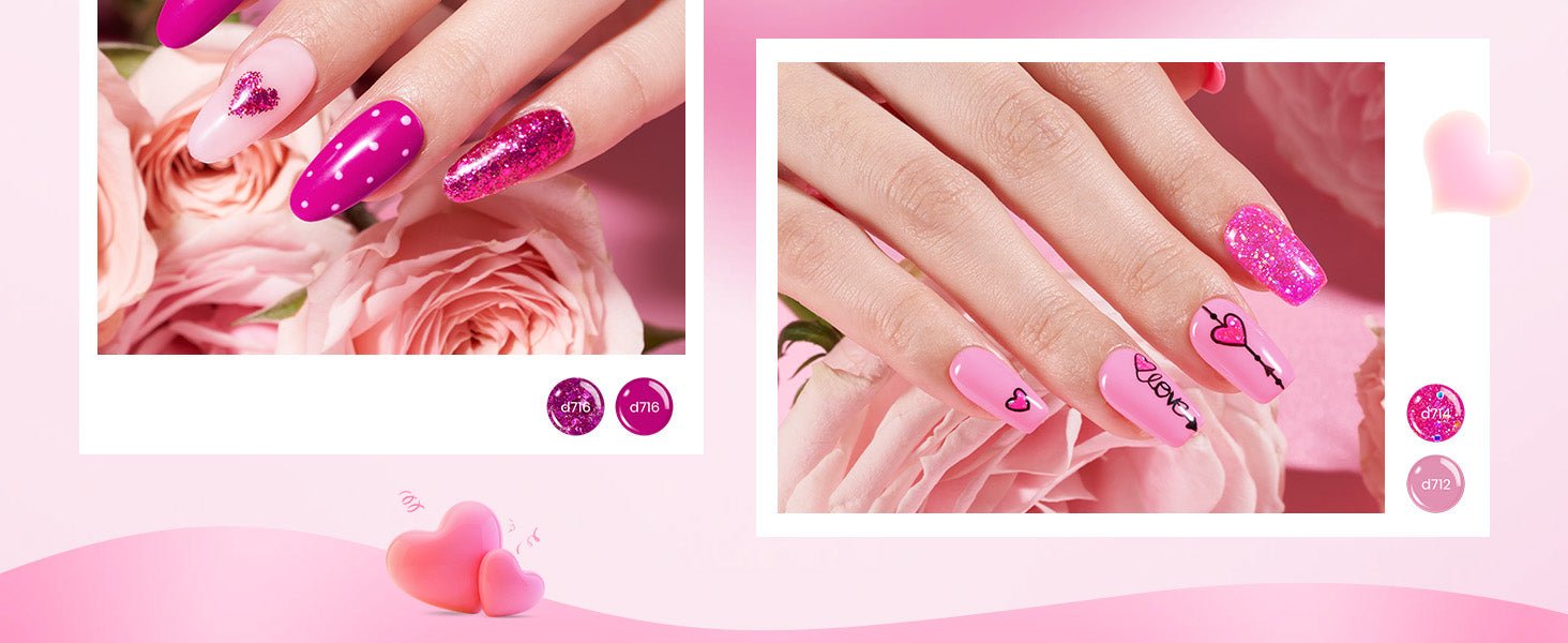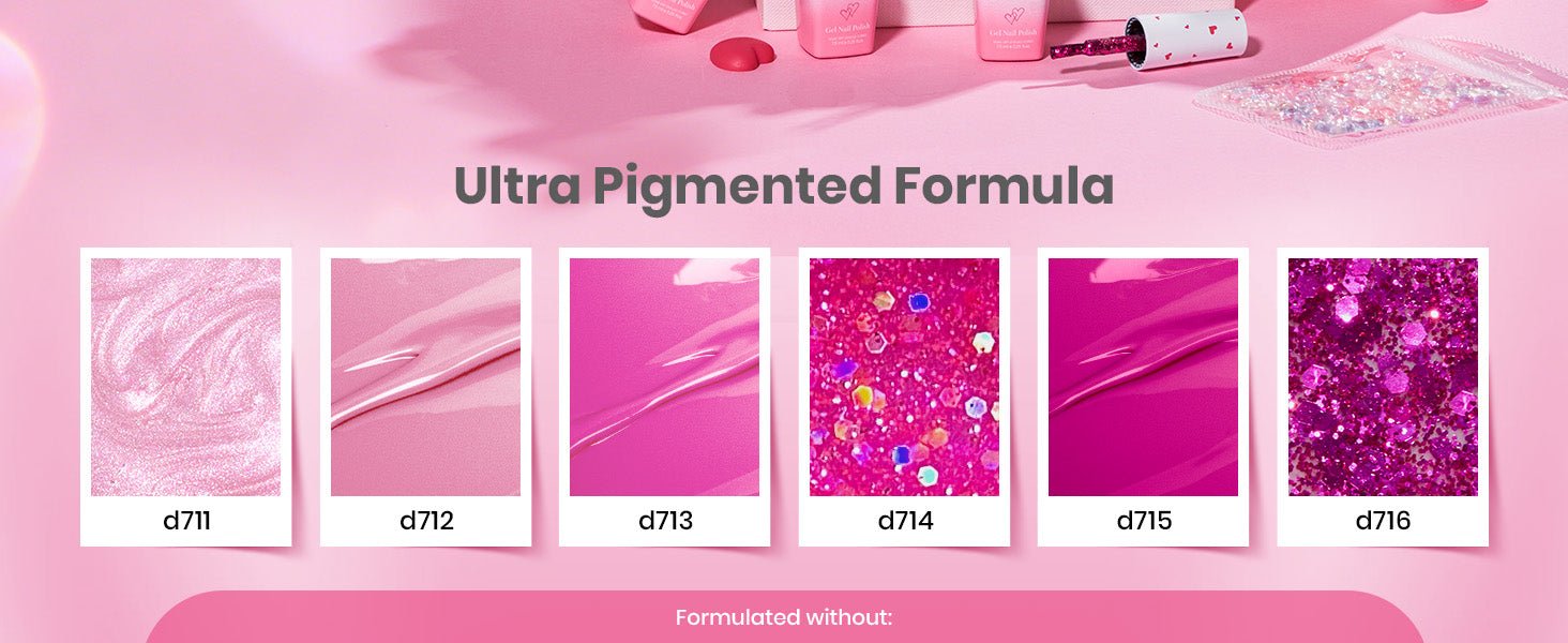 - 6 Pink Colors Gel Nail Polish with Nail Art Decorations: We have put together the top 6 trendiest colors of pink! 6 elegant shades of popular and trendy colors suitable for all seasons and daily routine life! Color number are:d711, d712, d713, d714, d715, d716.