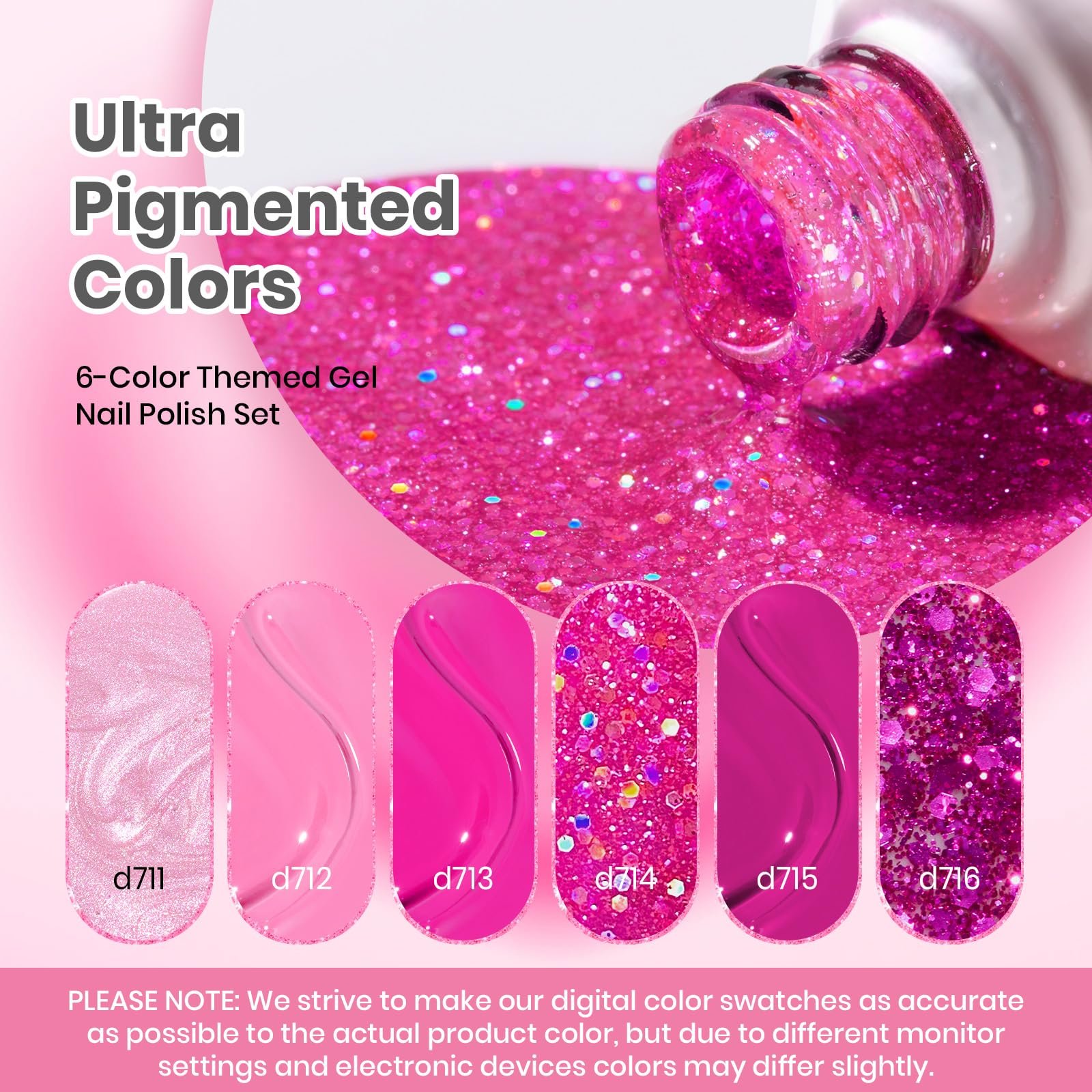 - 6 Pink Colors Gel Nail Polish with Nail Art Decorations: We have put together the top 6 trendiest colors of pink! 6 elegant shades of popular and trendy colors suitable for all seasons and daily routine life! Color number are:d711, d712, d713, d714, d715, d716.
