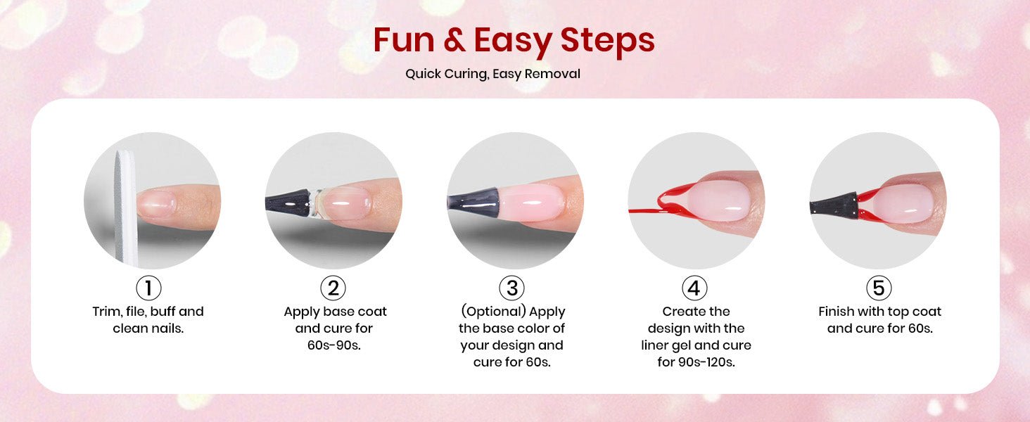 - Application: This is liner gel polish; it must be cured using a nail lamp. Average for an LED nail lamp curing for 60-120 secs. While providing remarkable longevity—up, up to 28 days of wear without chipping, fading, or yellowing.