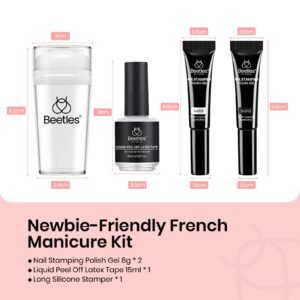 Beetles French Tip Tool: This Stamp Gel Silicone Nail Stamp Kit, perfect for Home Manicure Diy Nail Salon, includes nail stamping polish gel 8g*2, liquid peel-off latex tape*1,long silicone stamper*1. You can take your favorite patterns on the scraper and then stamp. This nail art printing tool helps you to DIY nail art easily and quickly. High-Quality Nail Stamper: Beetles clear soft silicone French tip stamp, designed to fit the curvature of your nails well, this tool will improve the quality and precision of your results with every use. Visible and Easy to use: The transparent bottle allows you to clearly see what is being embossed, ensuring that it is…