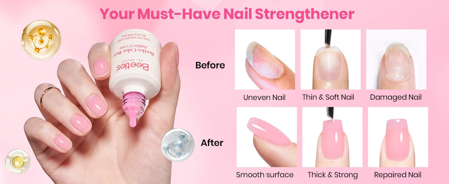 - Pink Rubber Base Builder Gel: A flexible rubber base formula that reinforces weak, thin, or peeling nails while adding natural thickness. Ideal for short nail extensions, overlays, and nail repair.
