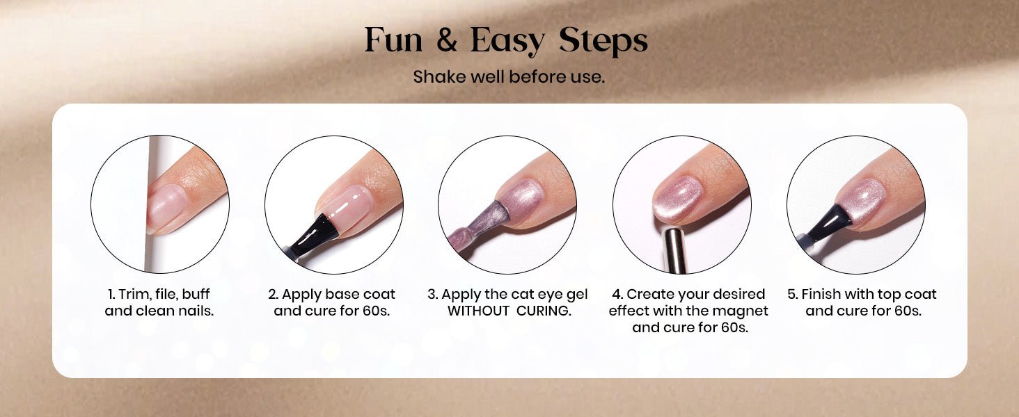 - 【Warm Tips】Please conduct a skin test before use with cat eye gel nail polish. Professionally formulated and only used for nails. Avoid contact with eyes, mouth, and skin. In case of contact with them, rinse immediately with water. Stop using the product if redness and itching developTips: Gently shake well before use—especially for metallic, glitter, and cat eye gel nail polish—to evenly mix natural settling of pigment particles.