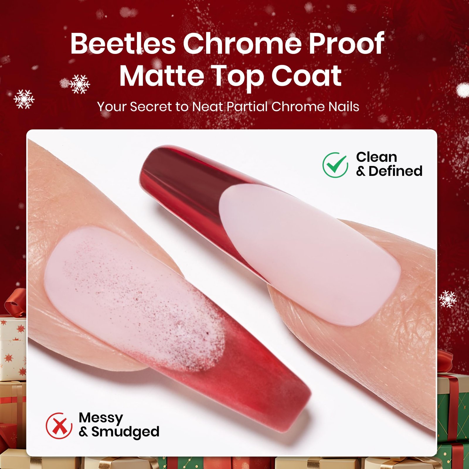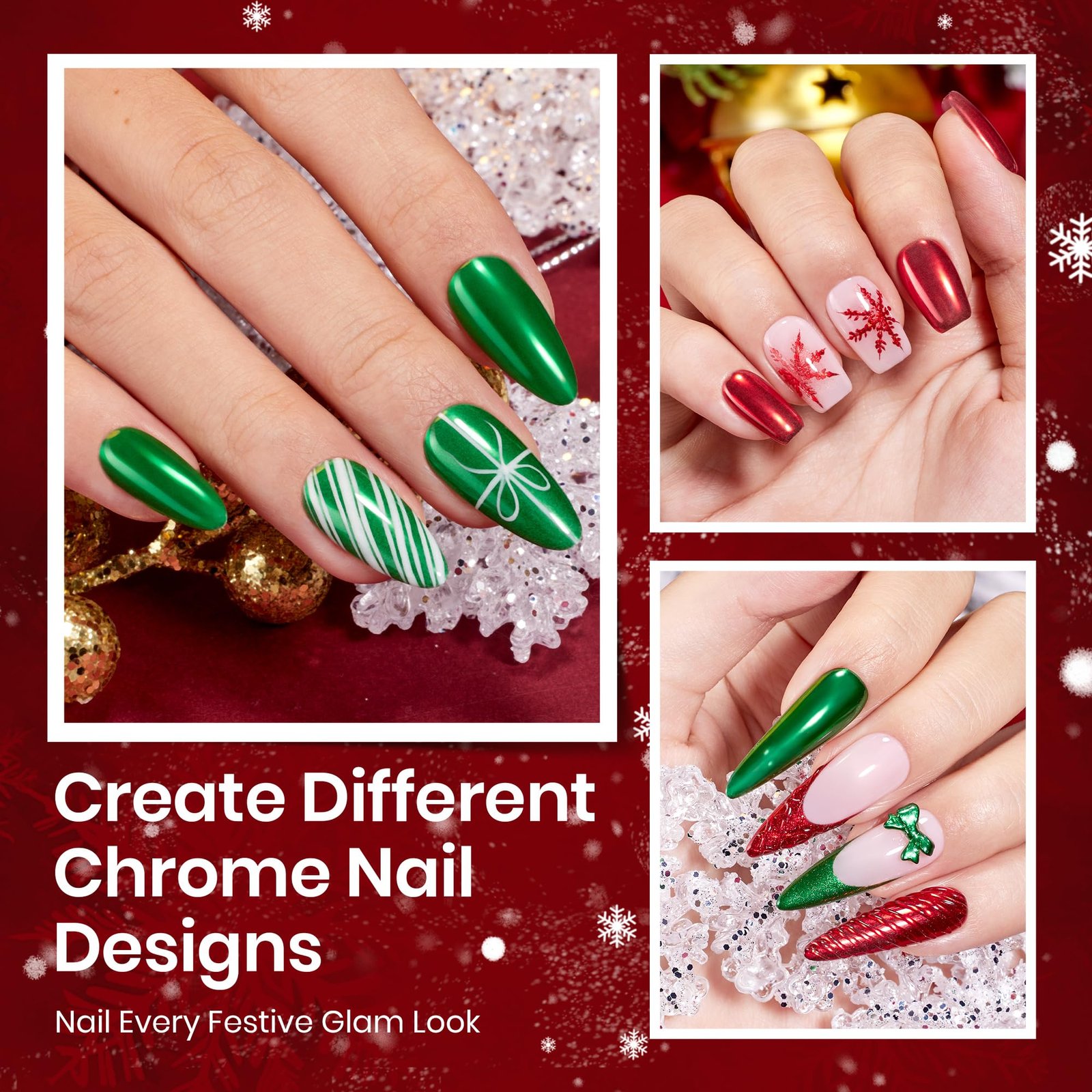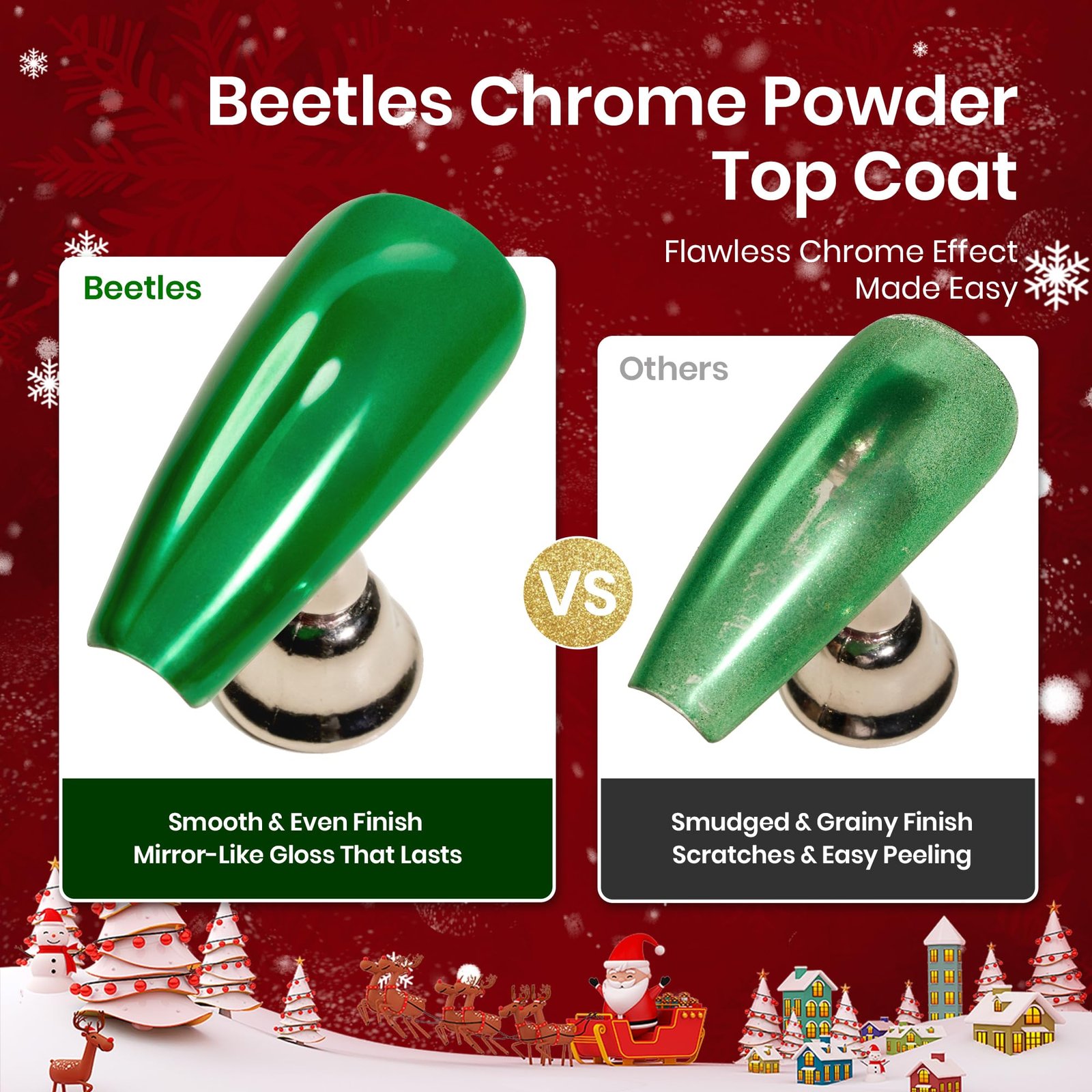 Christmas Chrome Top Coat Kit: Christmas Limited Chrome Top Coat Kit was launched especially for Christmas. Includes 15ml Chrome Top Coat ,15ml Matte Top Coat, 1g Red Green Mirror Chrome Nail Powder with a Sponge Stick. You can mix and match to create stunning and unique designs. Just unleash your creativity in Christmas DIY.