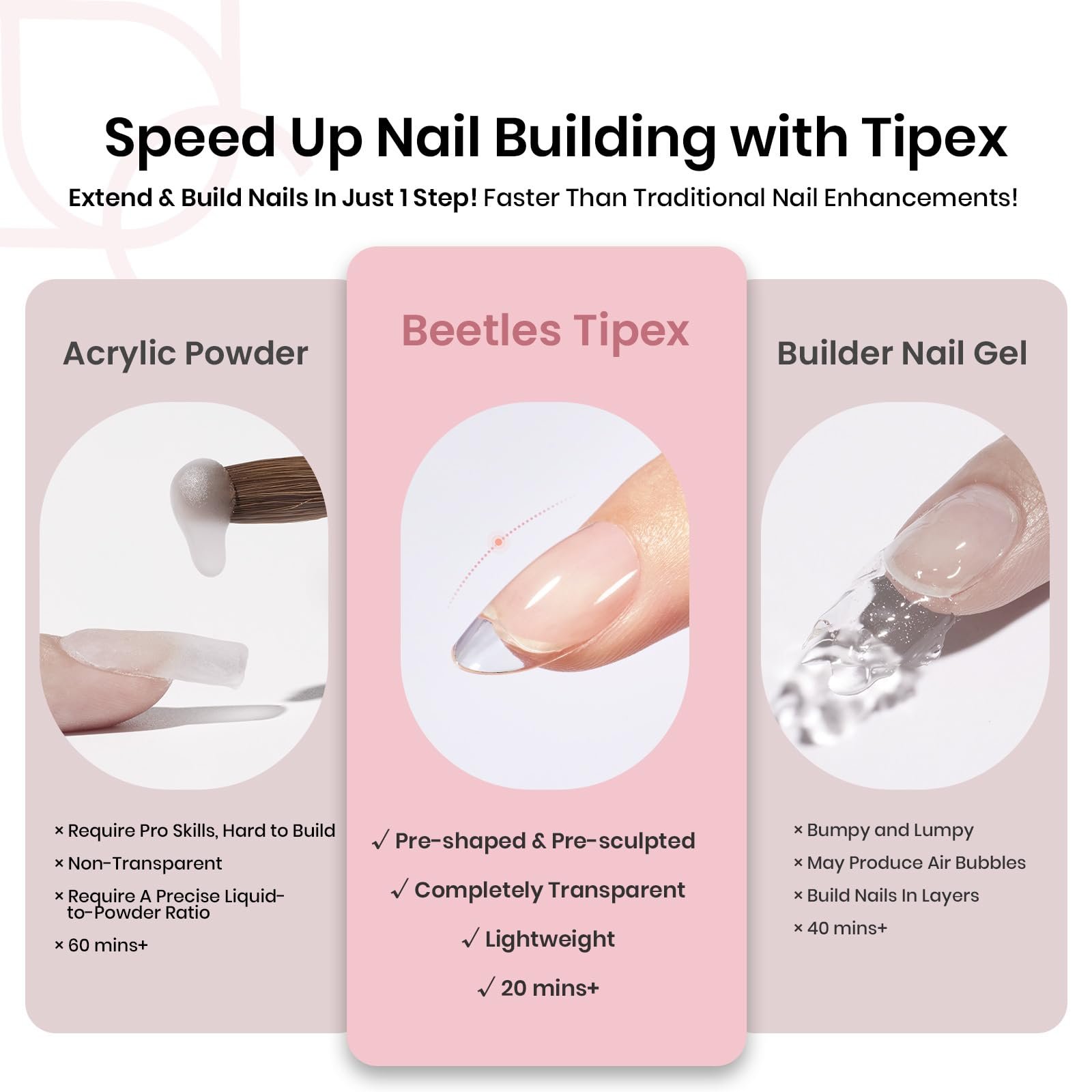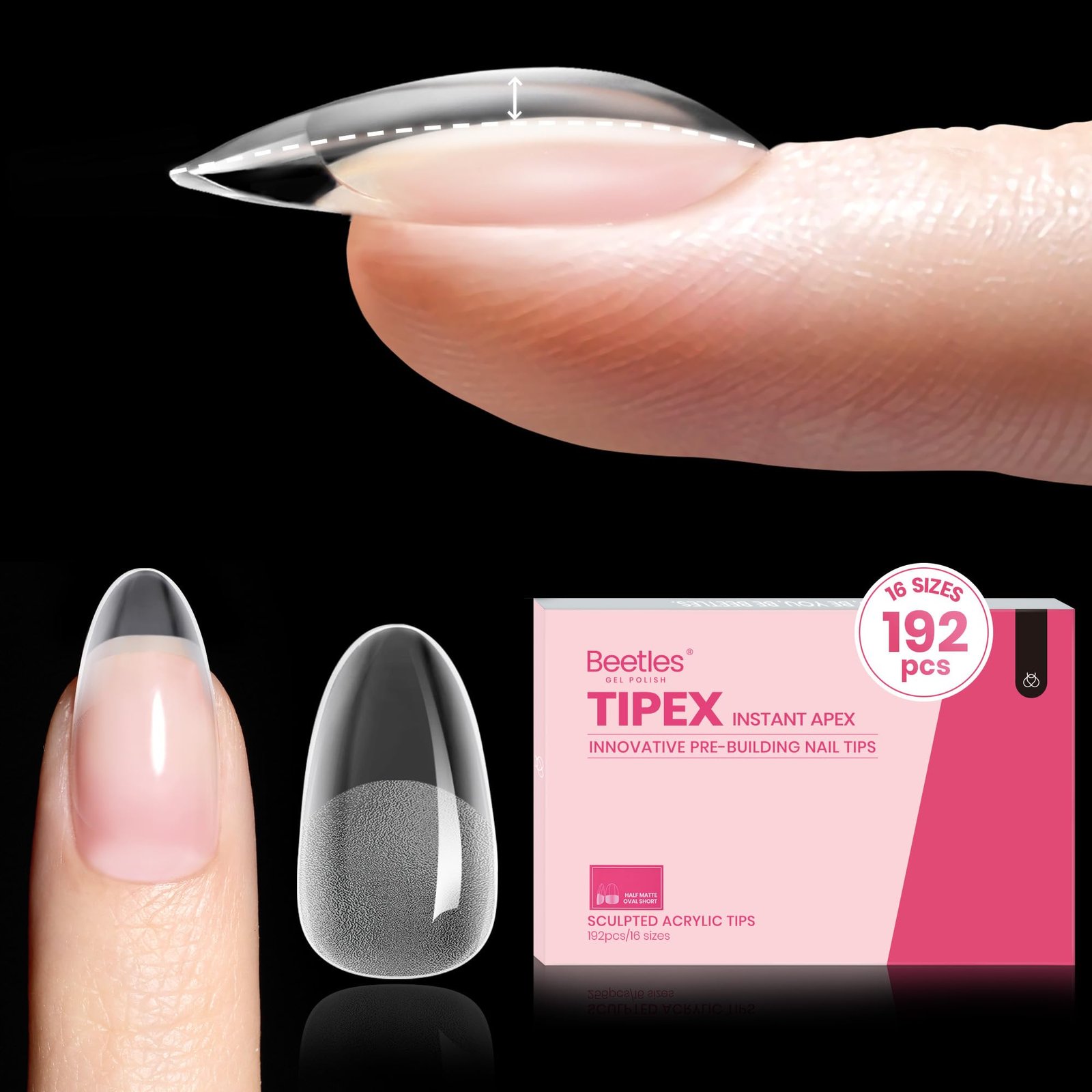 Quick Pre Building for Flat Nails: Beetles Tipex Nail tips come with a ready-made instant sculpted apex and the pre-filed underside for adhesion as well as the c-curve, eliminating the tedious tasks of fiddly building, nail extending, and shaping.Save your valuable time and give you beautiful nail shape! Warm Tips: *Due to their unique structure, significant trimming isn’t recommended for the best wearing experience.