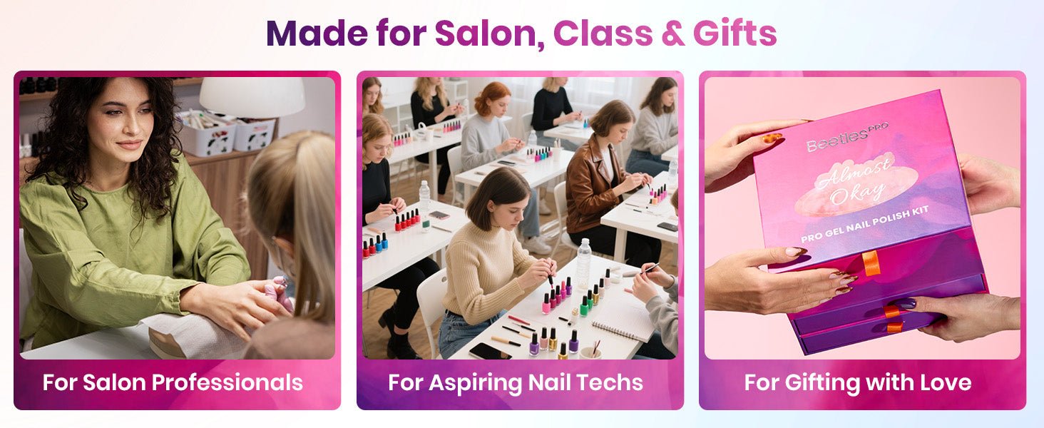 • 18 Signature All-Season Shades: Curated by Beetles PRO colorists, the Almost Okay Collection features 18 versatile salon tones — balanced across nude, neutral, and classic hues for year-round services. From timeless beige to muted mauve, every color complements any season and skin tone.