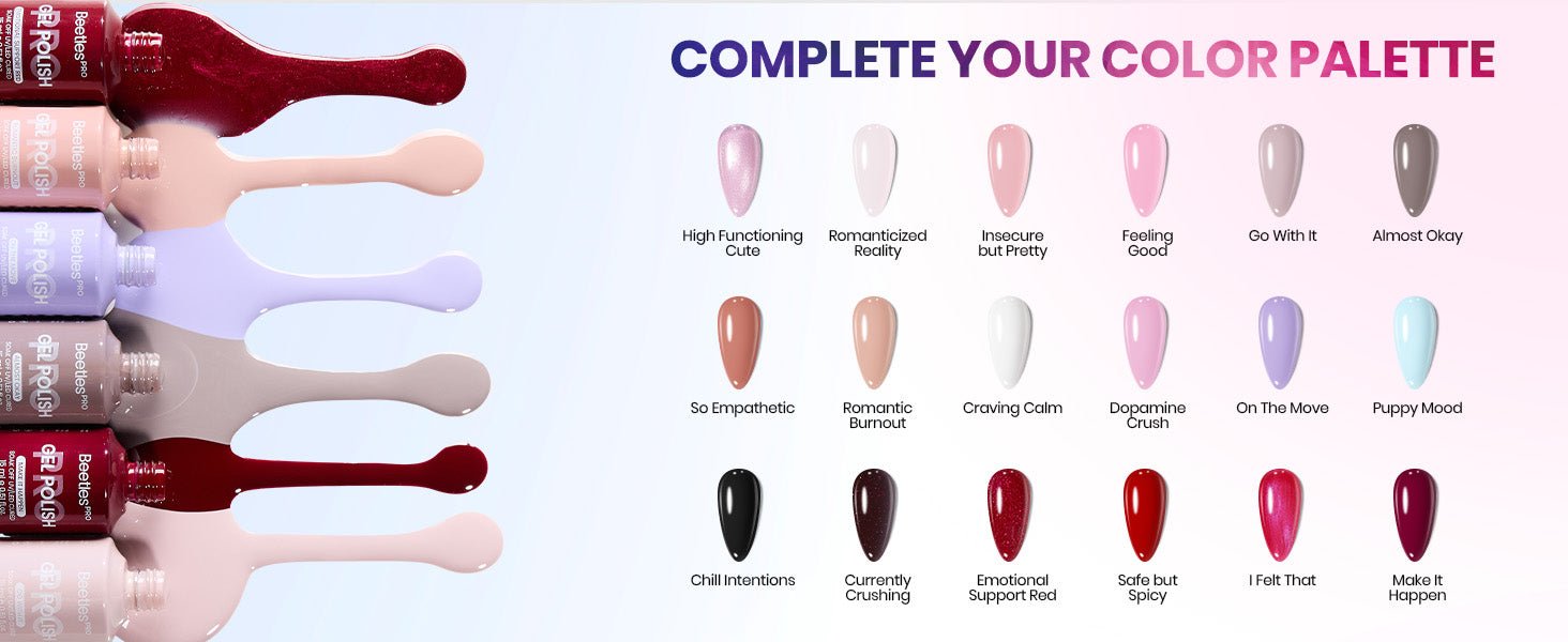 • 18 Signature All-Season Shades: Curated by Beetles PRO colorists, the Almost Okay Collection features 18 versatile salon tones — balanced across nude, neutral, and classic hues for year-round services. From timeless beige to muted mauve, every color complements any season and skin tone.