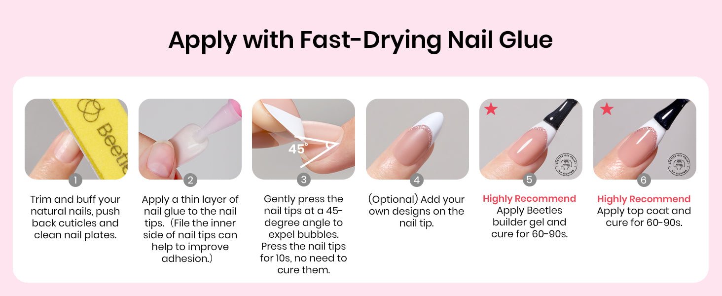 - Beetle Soft Gel: French tip press on nails short are made of Beetles proprietary mixed material Soft Gel injection molding. press on nails short has the characteristics of a soft rear edge and nail surface that fits the nail, comfort up! The front edge is tough and wear-resista