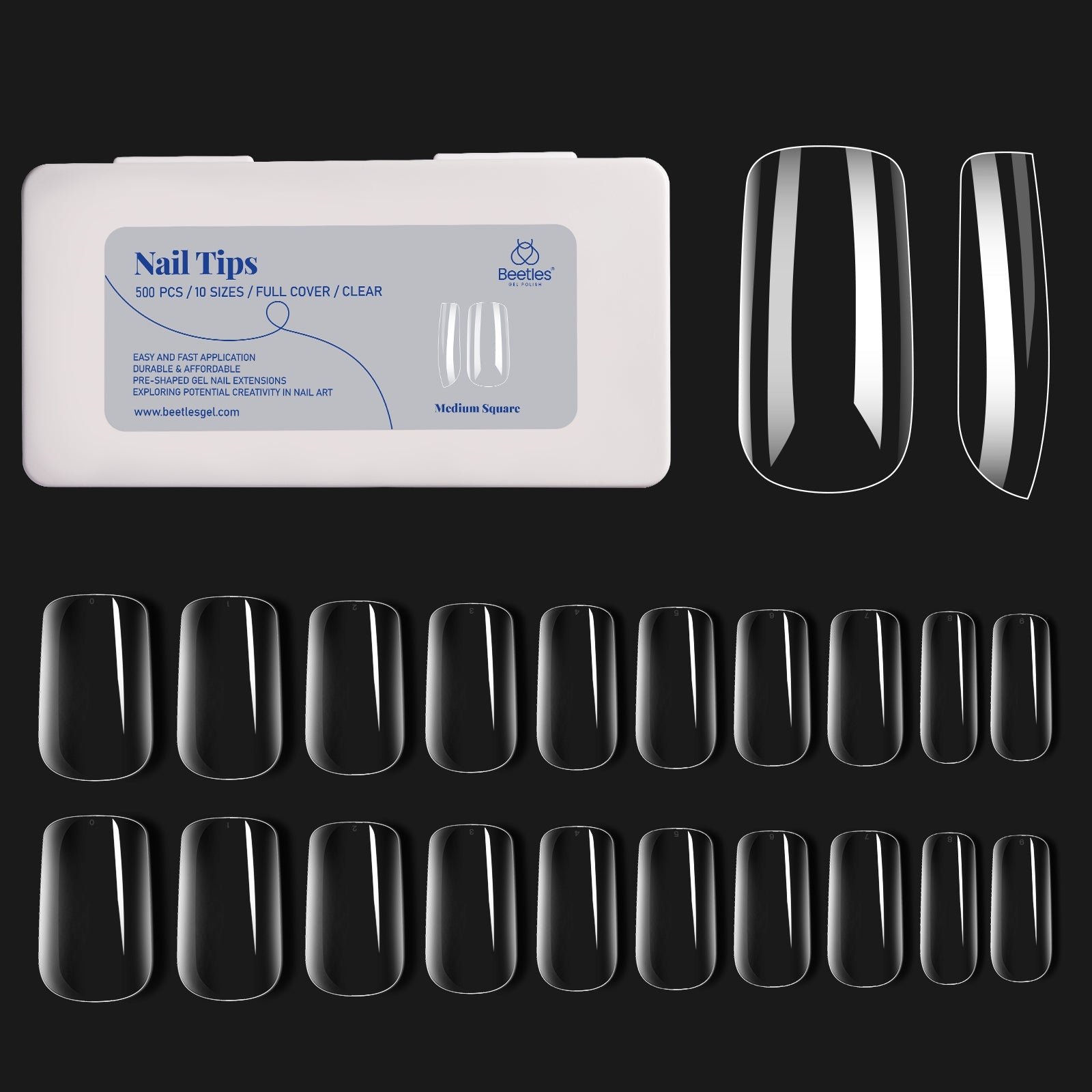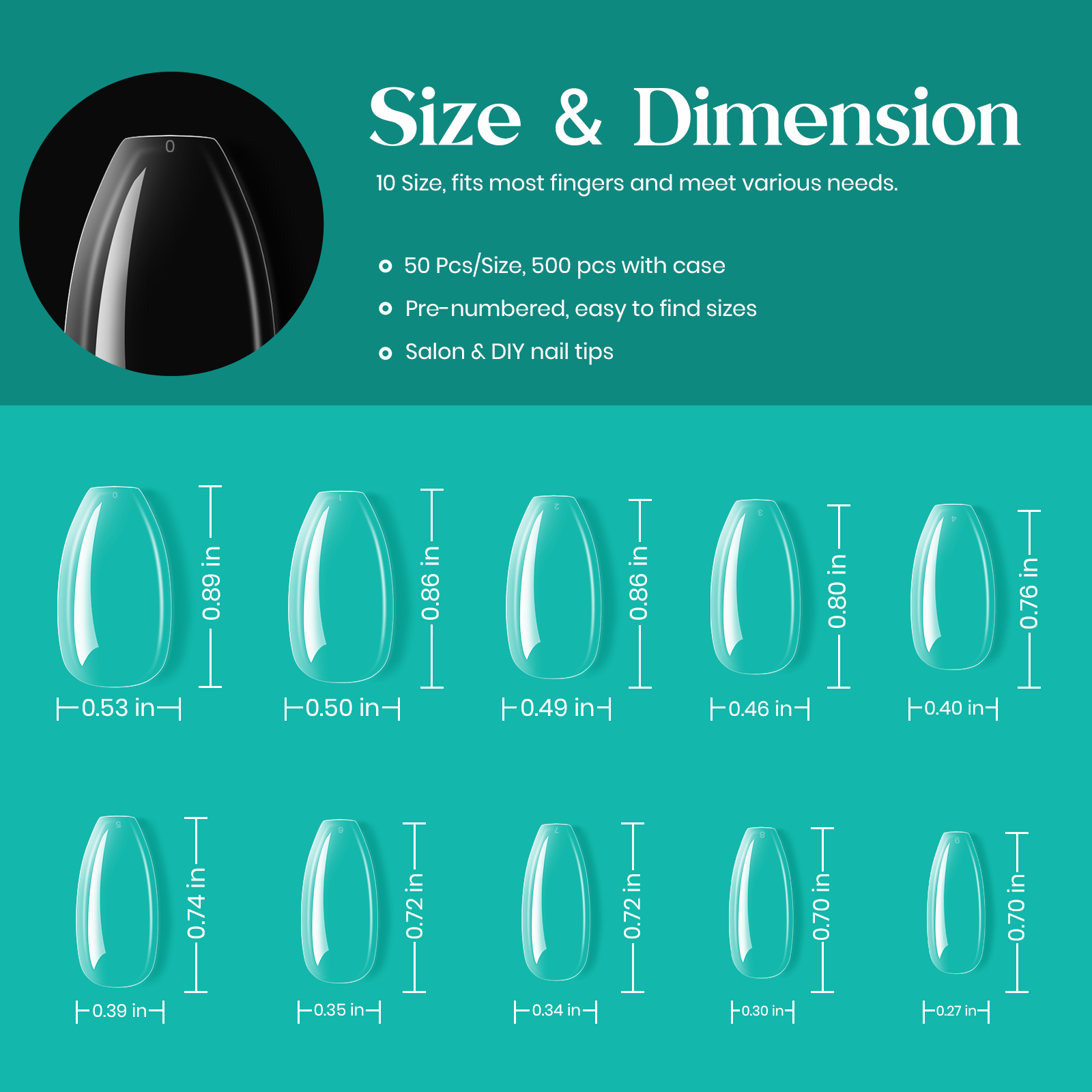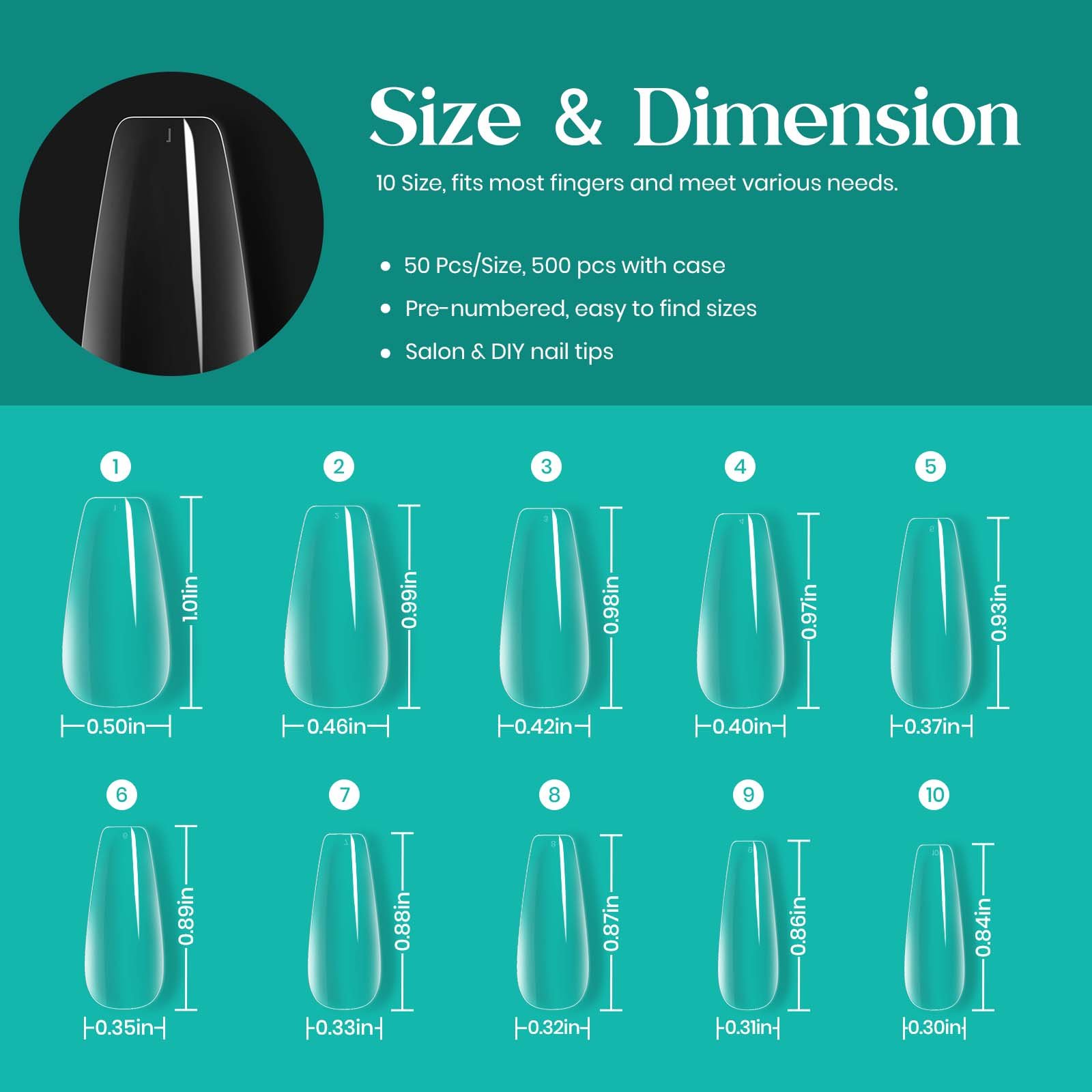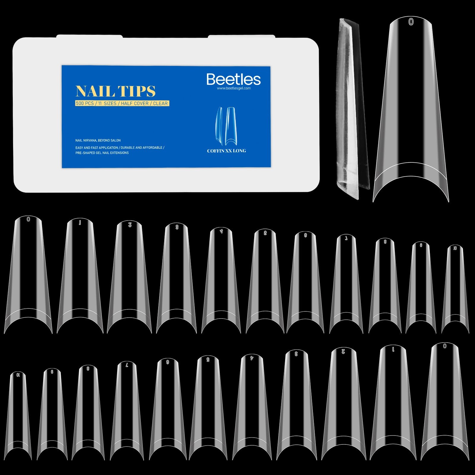 Gel Nail Tips Pre-shaped Extension System Clear False Nail | 500 pcs, 10 sizes