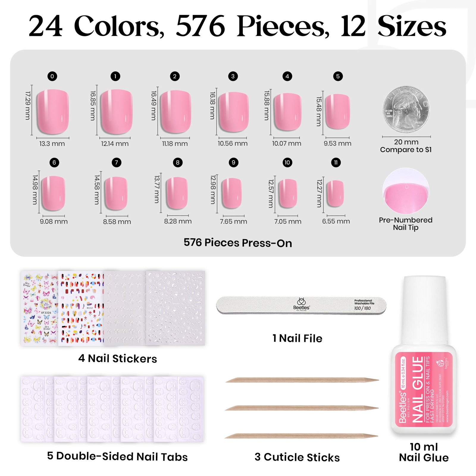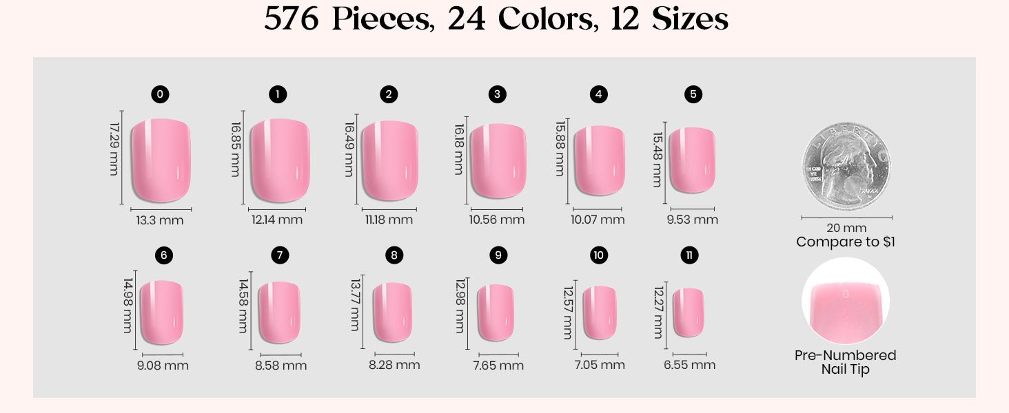 【All In One Kit】The short press on nails kit include 576pcs short Squaval press on nails in 12 Sizes, 12 matte solid colors and 12 glossy solid color. Total 24 colors includes various styles. And 10g nail glue, 5 sheets totaling 120pcs of adhesive nail tabs, 3pcs nail sticks, 1pcs 100/180 nail file and 4 sheets nail stickers. The set includes all the essential nail tools for any occasion and style you want to wear all year round, with no need to buy additional accessories.